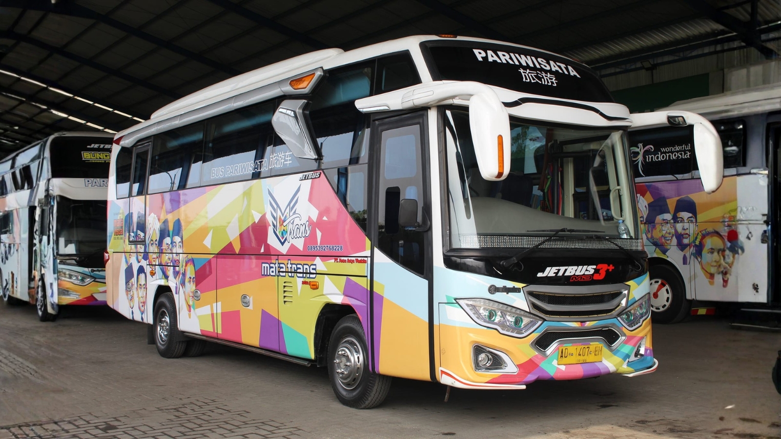 • Jetbus 5 SHD – bus pariwisata kelas atas dengan tampilan modern dan interior luas.